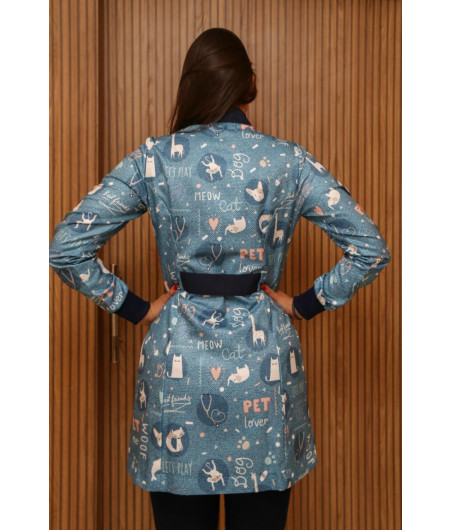 O Jaleco Feminino Gola Padre Estampado Azul Love Animals e botões visíveis azul marinho é destinado para as Profissionais de Saúde modernas e estilosas.