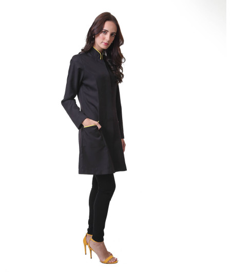O Jaleco Feminino Personalizado Gola Padre Black (Preto) and Yellow (Amarelo) Acinturadoé destinado para asProfissionais de Saúde modernas e estilosas.