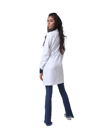 O Jaleco Feminino Personalizado Gola Padre Branco com botões visíveis e punho Azul Marinho Cláudia é destinado para as Profissionais de Saúde modernas e estilosas.