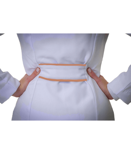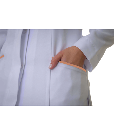 O Jaleco Feminino Personalizado Gola Padre Branco com Debrum Rosê é destinado para as Profissionais de Saúde modernas e estilosas.