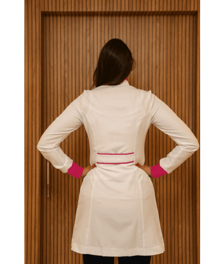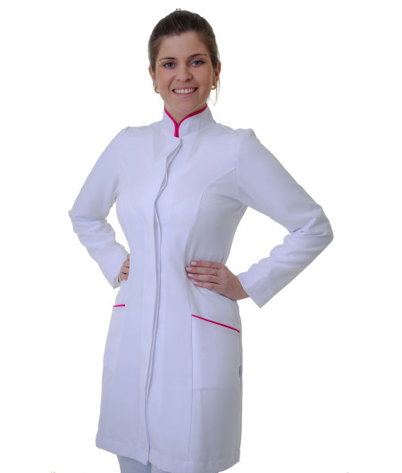 O Jaleco Feminino Personalizado Branco Gola Padre com Debrum Rosa Chiclete com Punho é destinado para as Profissionais de Saúde modernas e estilosas.