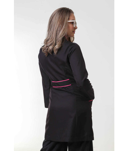 O Jaleco Feminino Personalizado Gola Padre Preto com Debrum Rosa Chiclete é destinado para as Profissionais de Saúde modernas e estilosas.