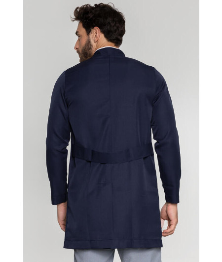 Valorize sua Imagem Profissional com o Jaleco Masculino Personalizado Gola Padre Azul Marinho com debrum Branco que é destinado para os Profissionais de Saúde modernos e estilosos. Sem dúvida, esse jaleco é muito sofisticado podendo usar por cima do terno, com camisa e gravata.